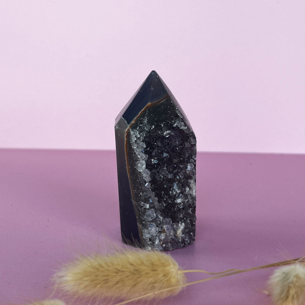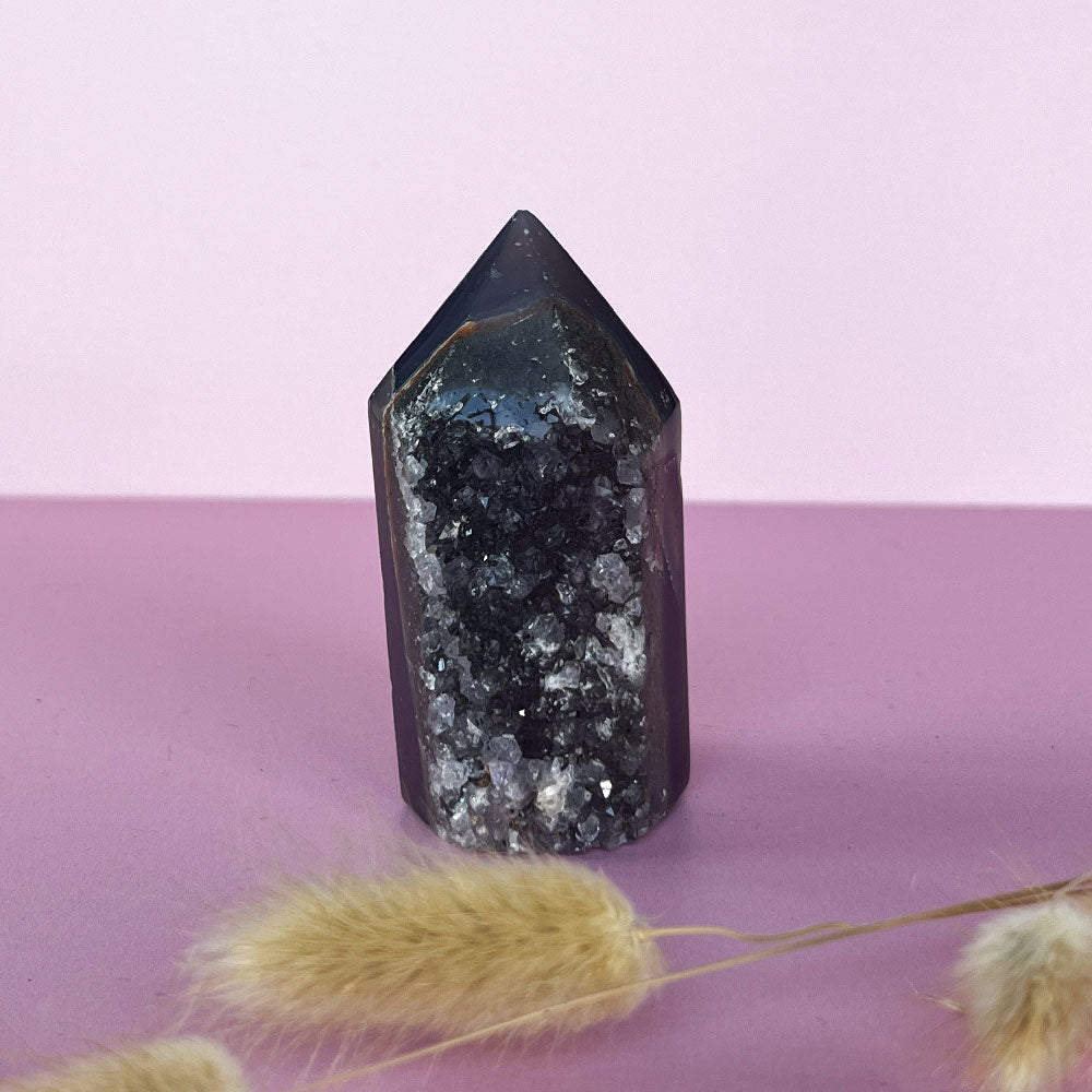 Een elegante druzy agaat punt met zachte aardetinten en een schitterende binnenkant vol mini-kristalletjes. Ieder stuk is uniek en straalt rust uit.