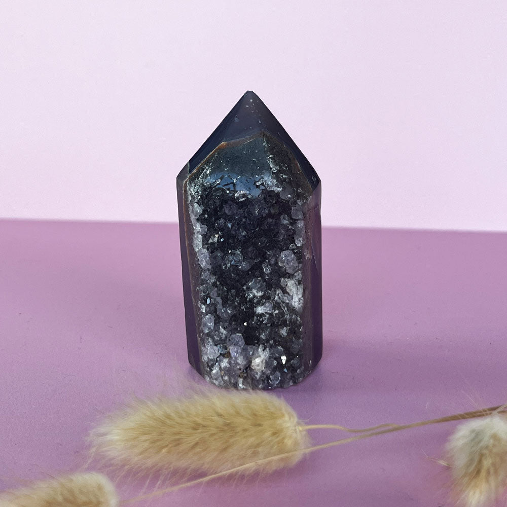 Druzy Agaat staat bekend om haar kalmerende en aardende energie. Ze helpt stress los te laten, brengt balans in emoties en creëert een gevoel van rust en harmonie.