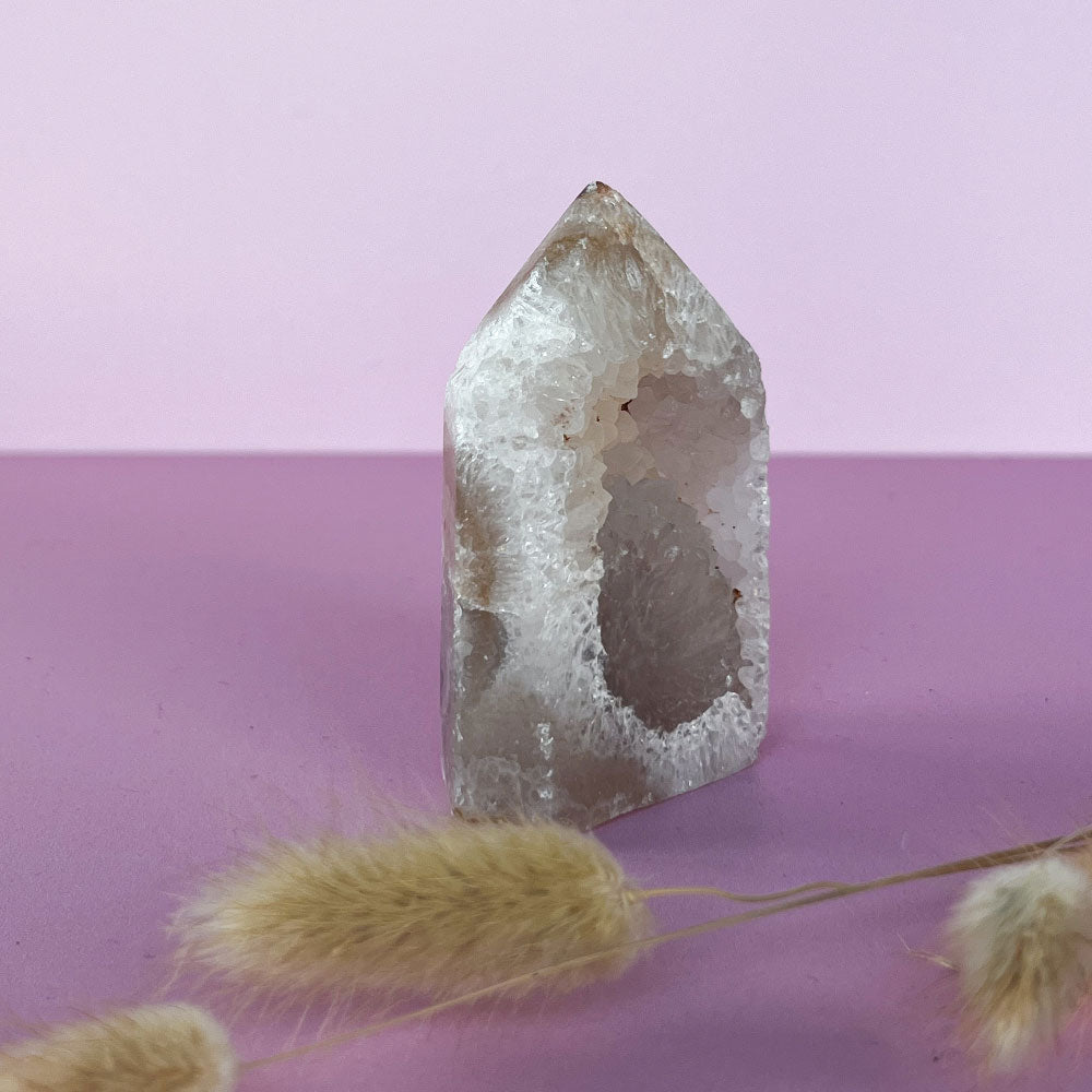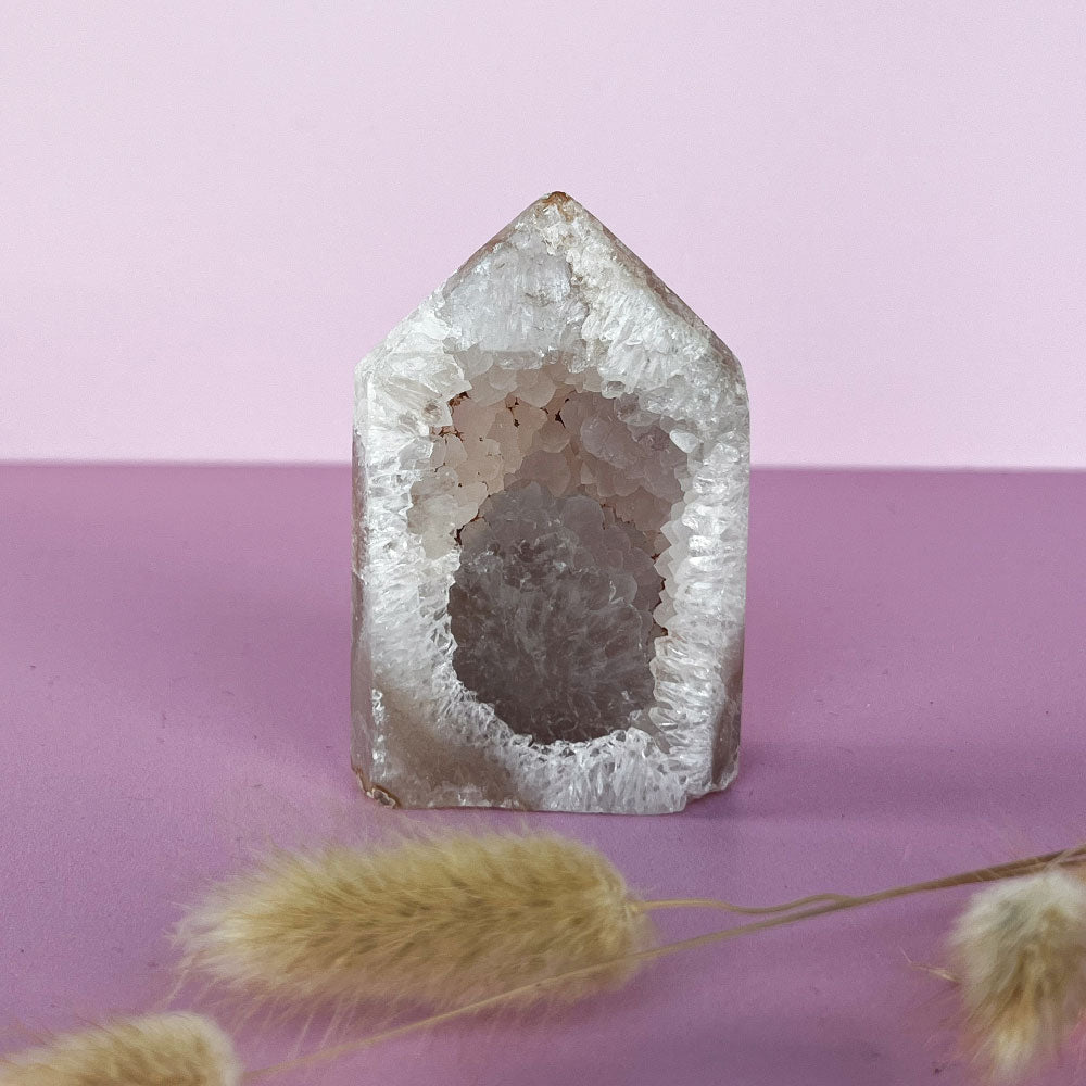 Een elegante druzy agaat punt met zachte aardetinten en een schitterende binnenkant vol mini-kristalletjes. Ieder stuk is uniek en straalt rust uit.
