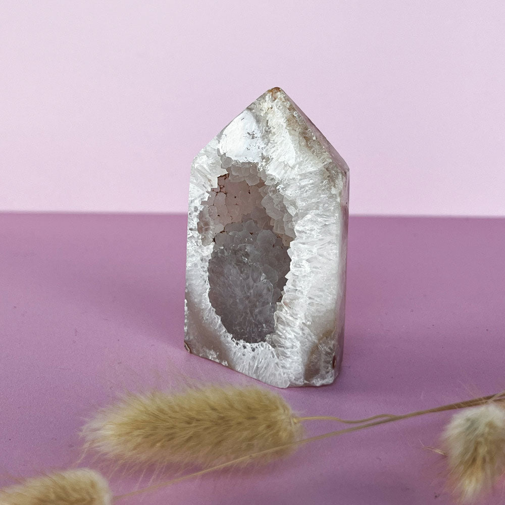 Druzy Agaat staat bekend om haar kalmerende en aardende energie. Ze helpt stress los te laten, brengt balans in emoties en creëert een gevoel van rust en harmonie.