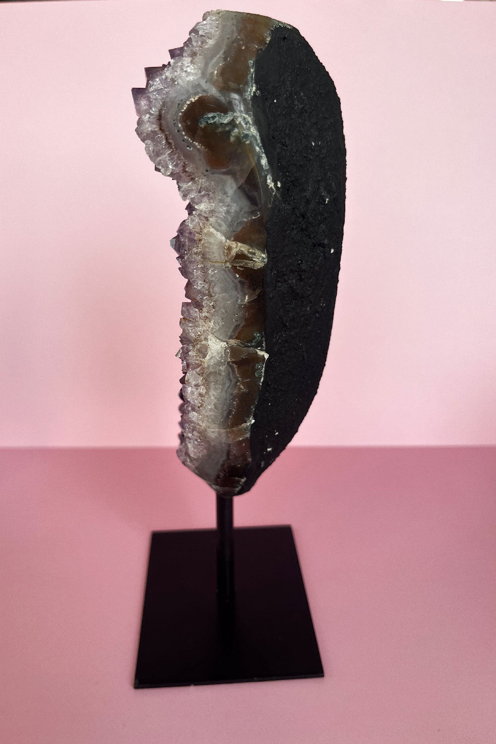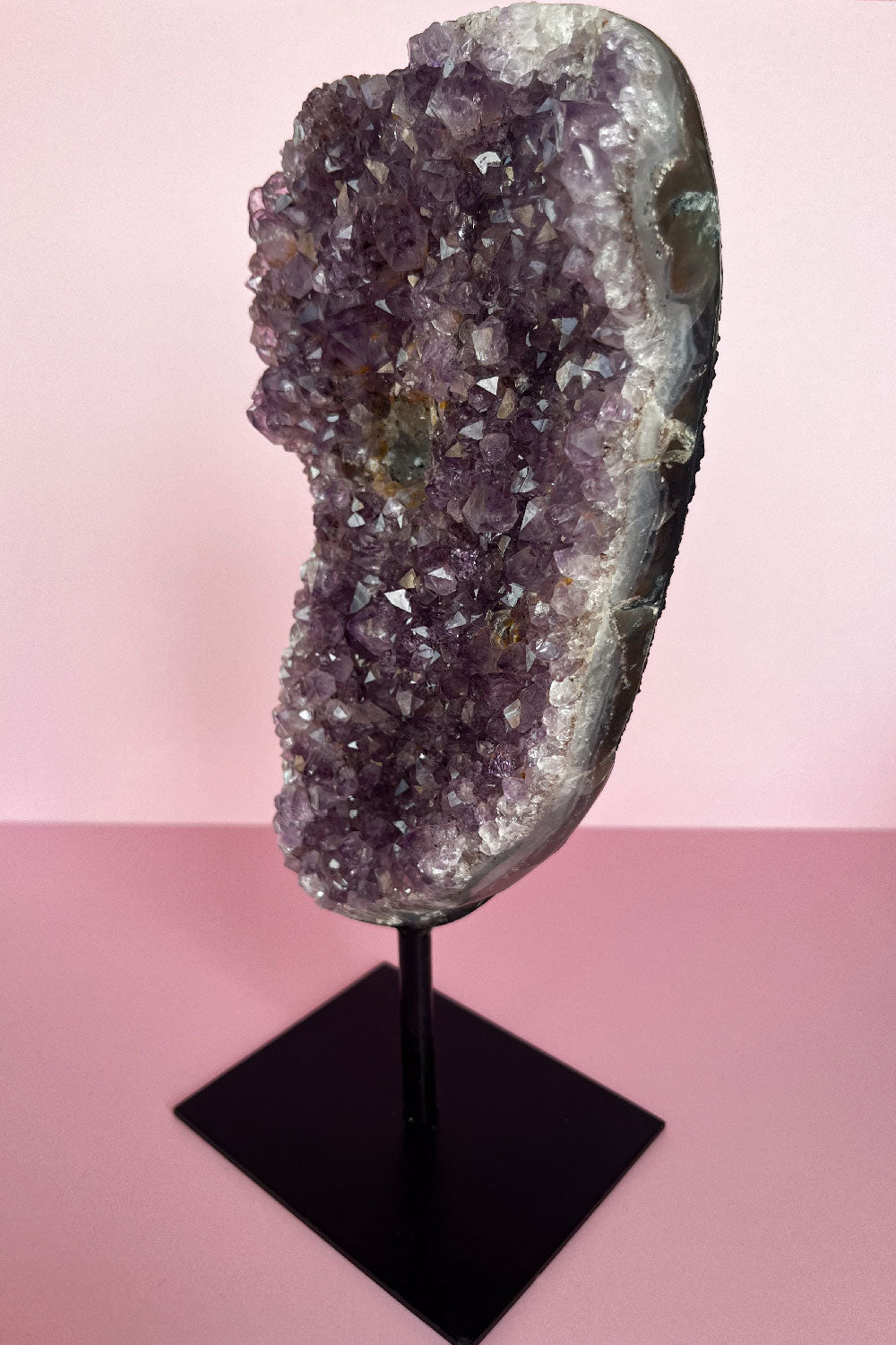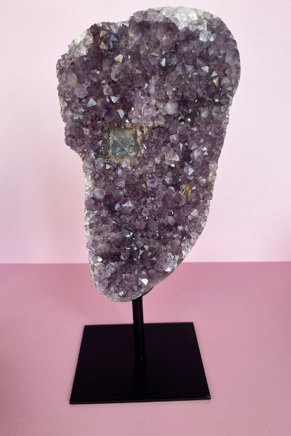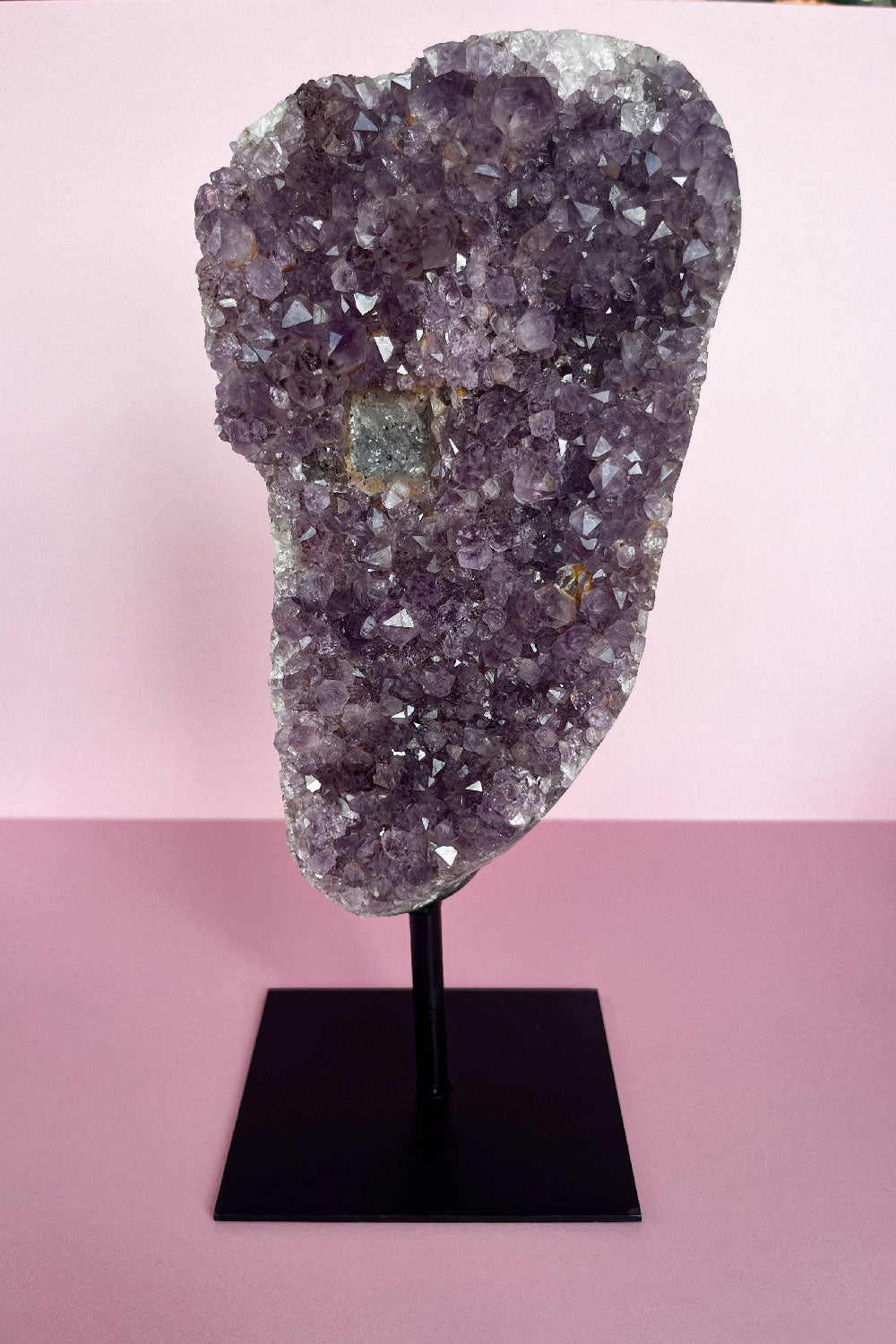 Dit unieke item is echt een eye catcher in je interieur. Een prachtige amethist cluster op standaard. De amethist is afkomstig uit Brazilië en heeft een totale hoogte van 25cm en weegt wel 1,5kg!
