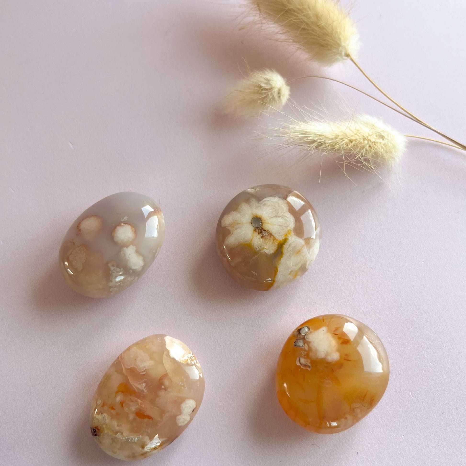 Een gladde, handzame steen met bloemachtige patronen in zachte, romige tinten. Bloemagaat is geliefd om haar vrouwelijke, liefdevolle energie die je helpt groeien vanuit zachtheid.