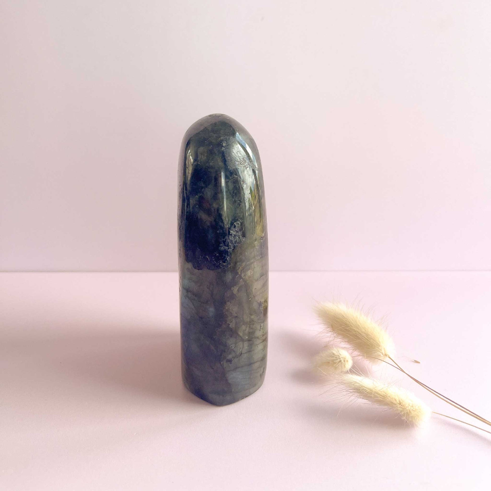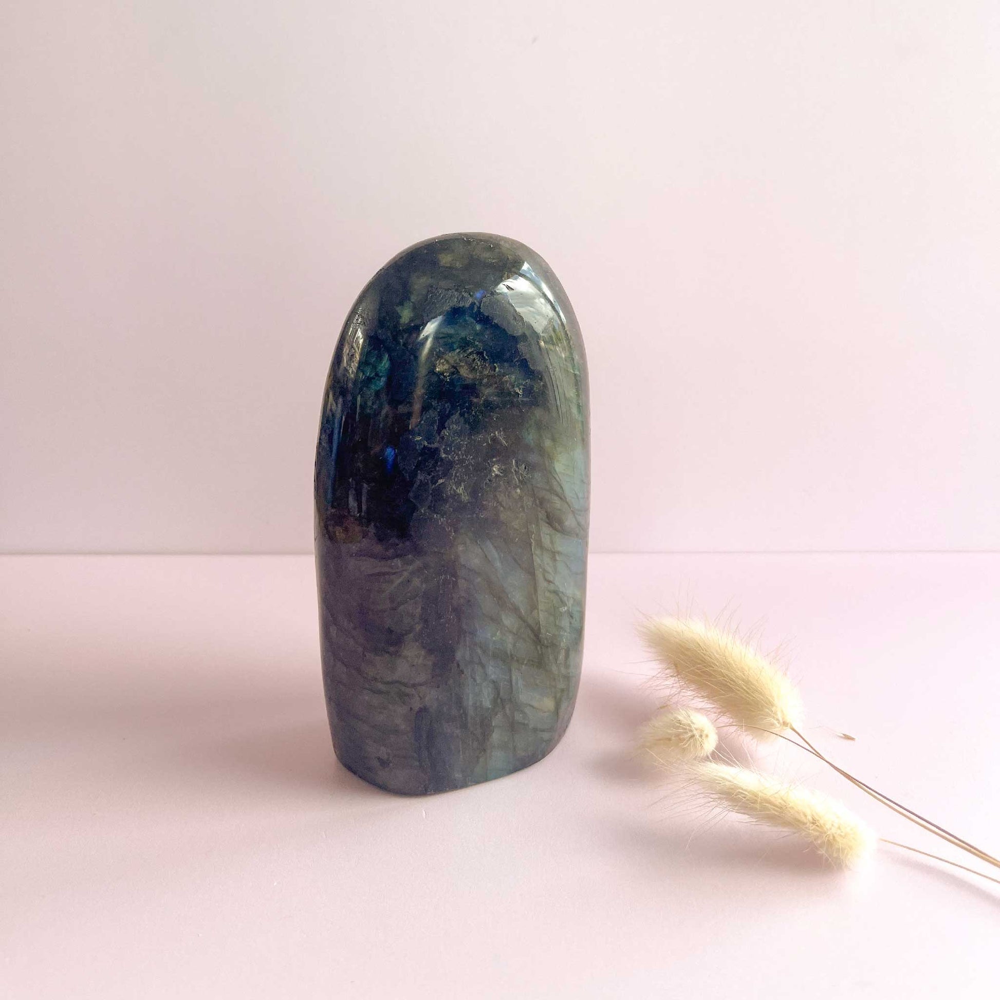 Een mystieke steen met blauwgroene flitsen en een magische gloed. Labradoriet is dé steen van bescherming en intuïtie – en dit sculptuur heeft een krachtige uitstraling.